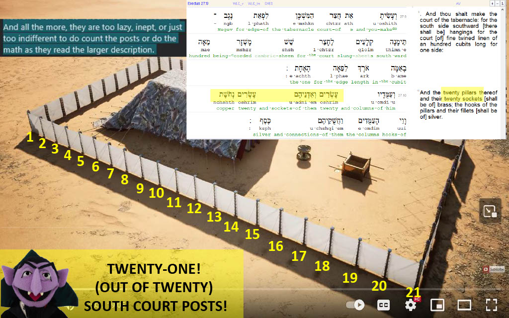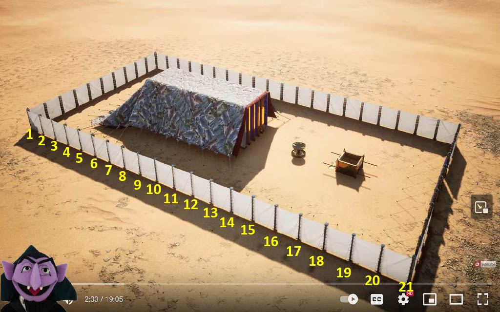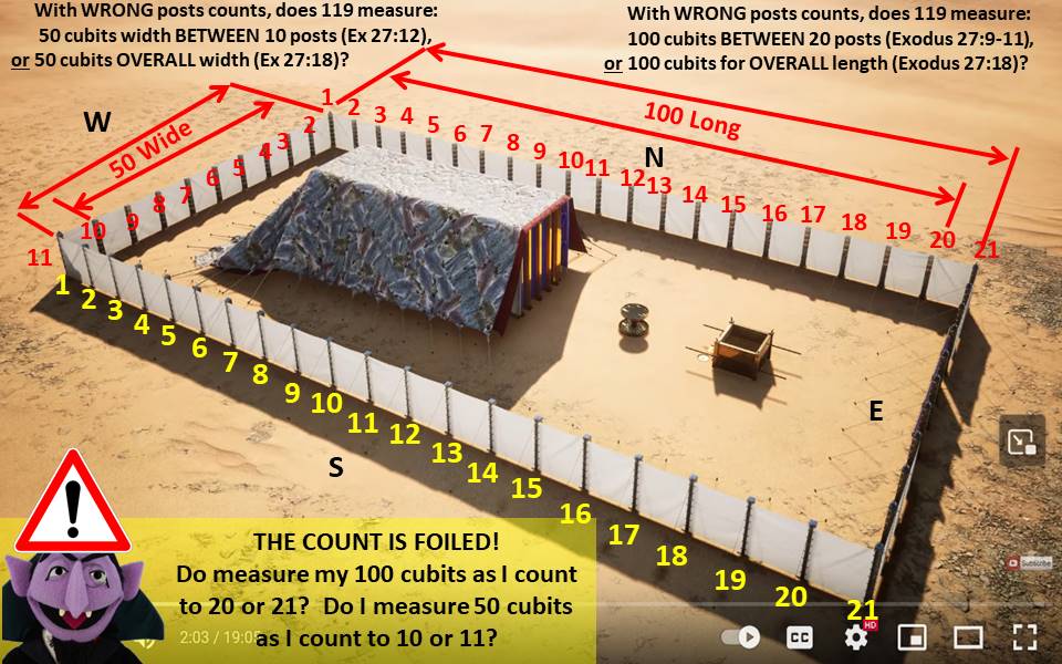 There are 21 posts on 119's demo CGI model, but it has the wrong number of posts as per Exodus 27:9 and 10, just as succinctly identified in the social media post and corresponding diagram below.