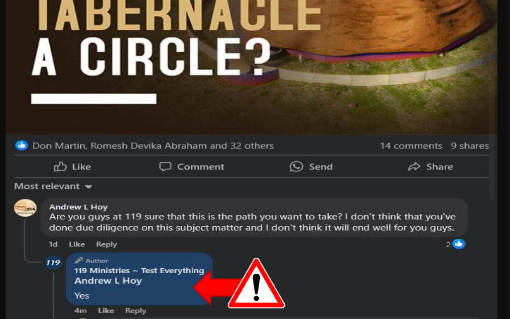 On Saturday the 15th of February, I got an email from Noel with invitation to come back on his YouTube channel for an interview, where Noel mentioned a recent 119 ministries critique video, which aired on Friday the 14th. The 119 ministires crew entitled it, “Was God’s Tabernacle a Circle’. While Noel offered some measure of warning, I was highly suspicious and equally amused by the title. After watching the video, it was clear that I was getting dragged into the court of public opinion—but without the courtesy of inquiry—much less the benefit of two or three witnesses. The 119 Ministries crew went so far as to advertise the prejudicial video on their home page, even featuring my own artistic content against me.
