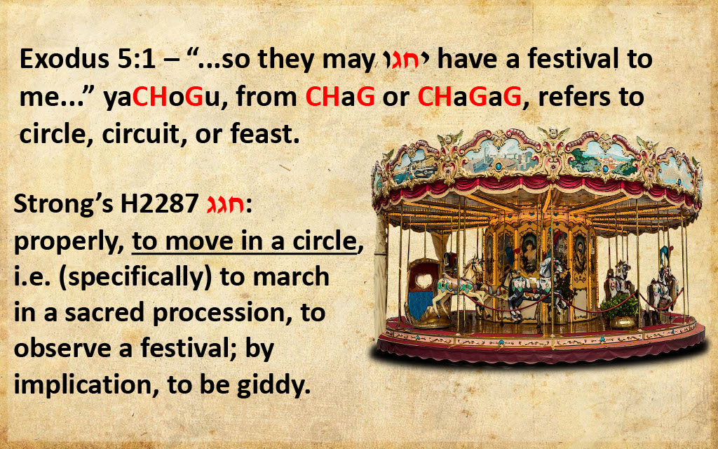 Question 11 (@1:02) -- Why doesn't 119 ministries mention that the Hebrew Exodus term for worship around the Tabernacle and "holy day" are rooted in חג, which conveys the idea of circle and circular?