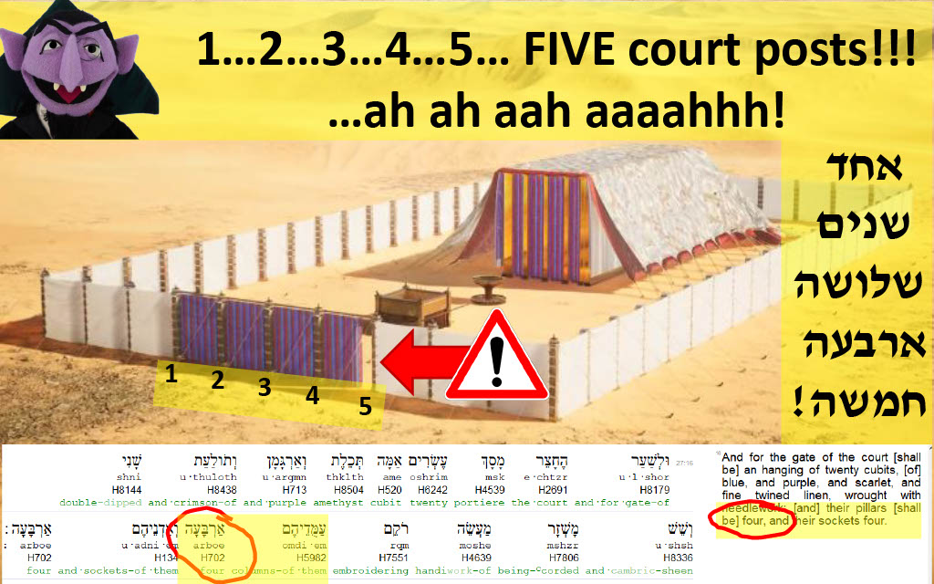 Question 12 (@1:04) -- Does 119 ministries know that according to Exodus 27:16, the courtyard gate is said to have four posts, and if so, can 119 ministries explain why their CGI model features five?