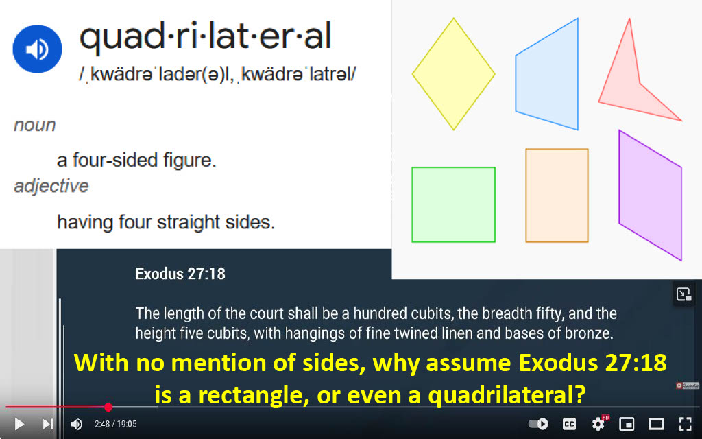 Question 21 (@2:48) -- How does 119 ministries know that the court is even a quadrilateral from Exodus 27:18, as a rectangle is defined by the number and arrangement of FOUR sides, when no references to sides are given in verse 18?