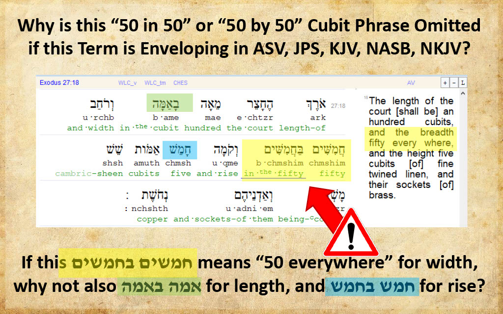 The Exodus 27:18a citations given by 119 ministries show that most ignore the חמשים בחמשים or 50 by 50 or perhaps 50 in 50 nuance altogether, with the more ambitious translations presenting this 50 by 50 language is enveloping nuance (i.e., using language like "50 everywhere"), but the lack of such language in the other two dimensions, i.e., length and height direction would not coincide with an enveloping purpose in translation here.