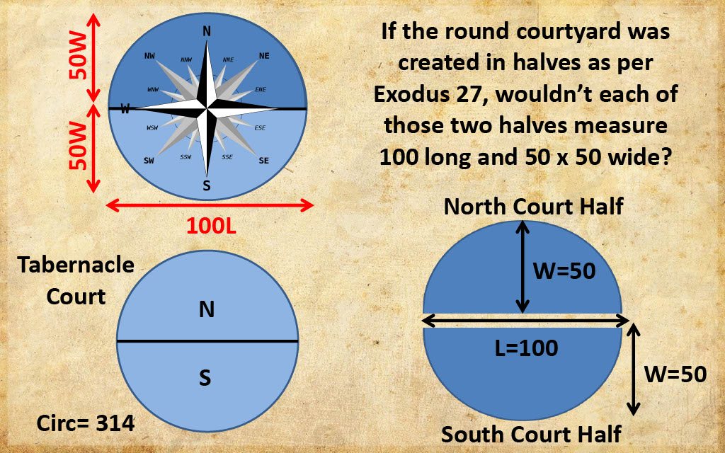 If two "width" directions are specified in the literal Exodus 27:18 text, they must be accounted for in some physical way. A round court made with two halves measure 50 wide seems to offer the best explanation, whereas a cuboid prism measuring a length of 100 long by 50 wide by 50 wide by 5 high would have four dimensions, and might need to be translated in a way as depicted below. Conversely, two courtyard halves comprised of semi circles could very easily account for the 50 by 50 width language.