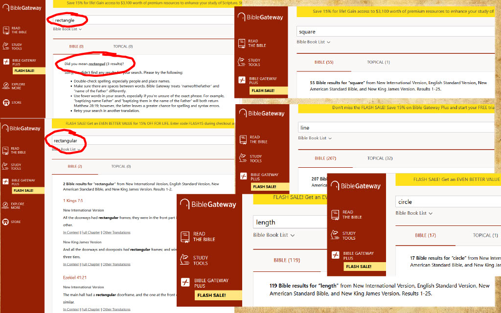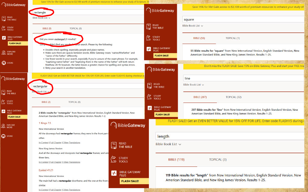 The 119 ministries video declares this repeatedly, yet search engines report exactly zero mention of rectangles in Exodus. Rectangle isn't a popular English Bible word.