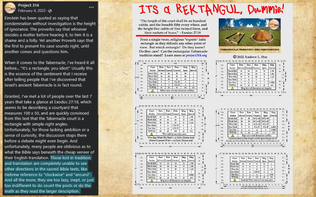 In contrast to Project 314, 119 ministries group has clearly mastered the art of social medial marketing over the last 15 years. Having produced enough content to begin their own 24/7 streaming channel, 119 has become a religious media giant, climbing up to 186k subscribers on their YouTube channel alone. In contrast, Project 314 has all but 2.5k subscribers. What’s more is that 119 Ministries has a 11 part series done on the Tabernacle, naturally assuming a rectangular interpretation paradigm, which they did back over the course of 2023-2024— which I had been completely oblivious to, since I lost interest in 119’s content perhaps close to ten years ago following the shutdown of open forum commenting on a controversial video topic that they had released. I thoroughly believed then—as well as now—that those who assume a role of teaching in the public square must stand accountable for public proclamations—especially in matters of faith and authoritative Scripture.