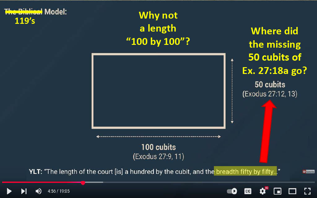 Question 32 (@4:56) -- Why does 119 ministries fail to account for the 50 by 50 language and the 100/21-20 & 50/11-10 courtyard post measurement and quantity dilemma in this oversimplified diagram while calling it the "biblical model"?