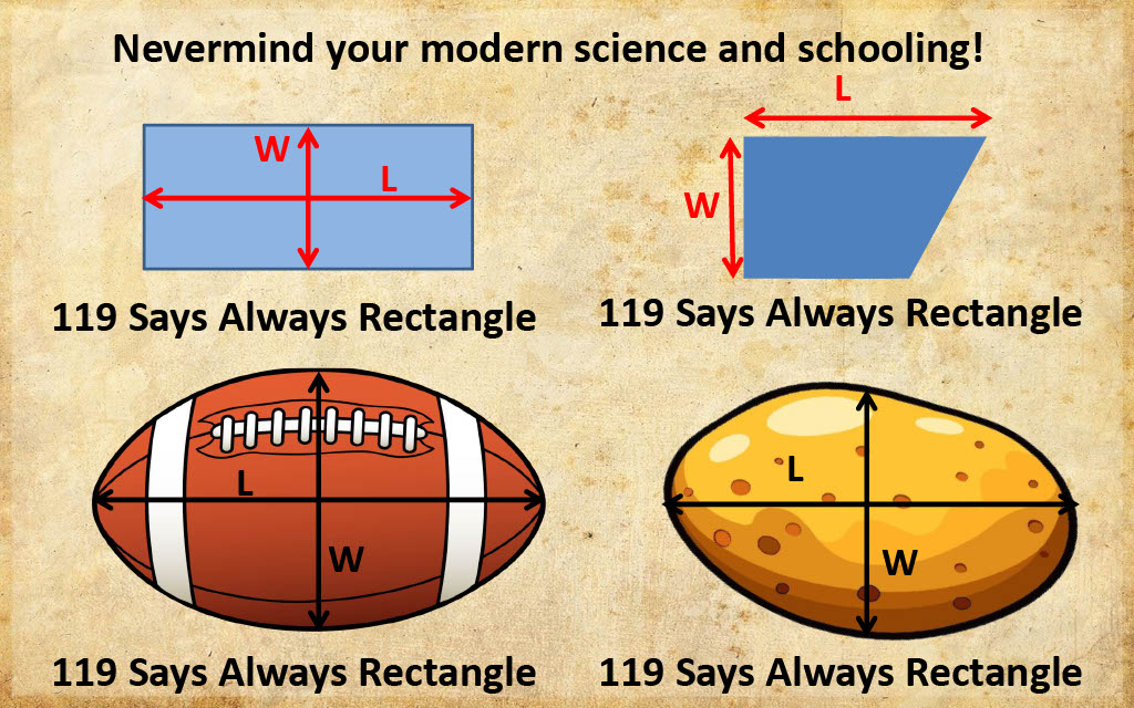 Before declaring that the "Tabernacle is a rectangle", it's first essential to define the criterion whereby a rectangle is accurately defined. Rectangles are planes with four straight sides and right angle corners. Every rectangle claim throughout the 119 ministries presentation is based on inference or presumption.