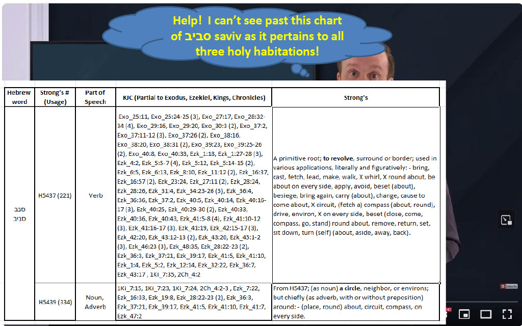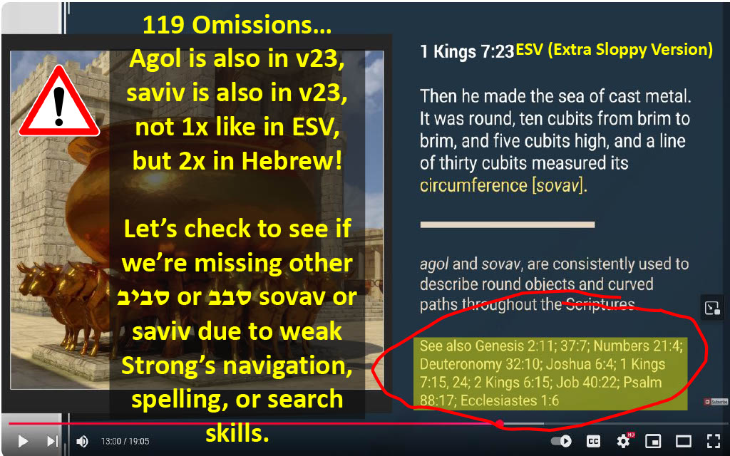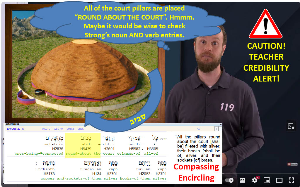 A review of the seven or eight minutes of relevant content in 119 ministries' "Was the Tabernacle a Circle" video, 119 demonstrates a fractional command of the round Tabernacle design and subject matter knowledge. and coincidentally fails in their review and application of four our of the four Hebrew words that they introduce. If the omissions were at best accidental, 119 would seem to have serious competency, discernment, or comprehension problems; whereas if the omissions were worst case deliberate, 119 ministries team has certain pride, honesty, and moral integrity problems.
