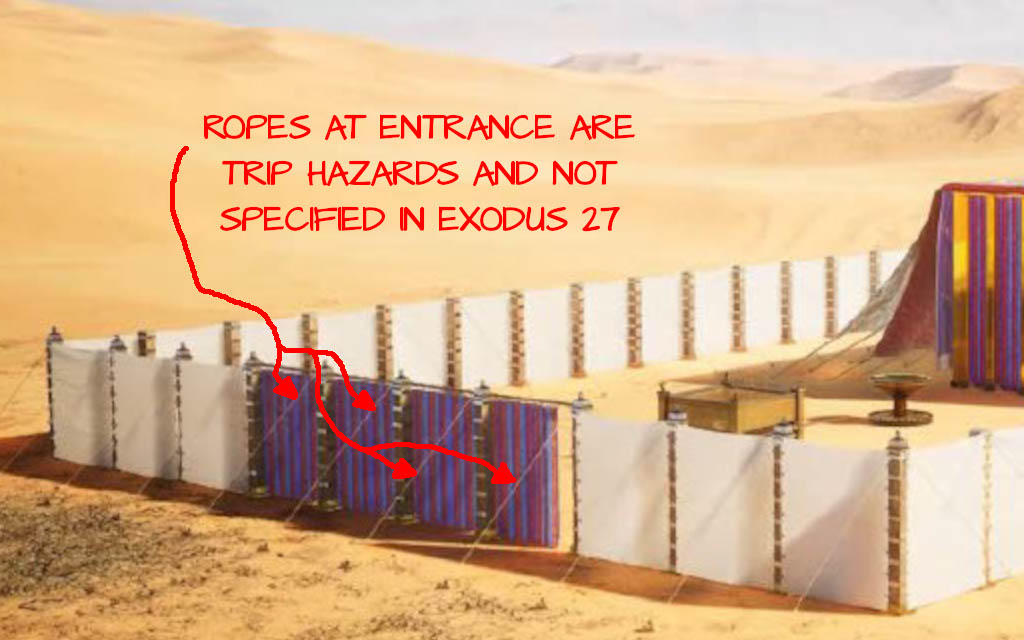 Question 90 (@1:14) -- Why does 119 ministries show ropes and pegs surrounding the entire Tabernacle when none are listed in the Exodus texts, and why would you want them (especially at the gate given the trip hazards that they impose visitors and workers?