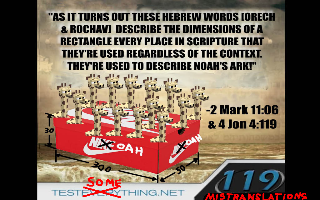 As alluded to previously, this is a case of bearing false witness. This is something never said by Hoy, whether in The House of El Shaddai, or on Project314.org. Diffusing meaning by translating by fracturing working definitions with more English words in a translation is STUPID. This could be interpreted and understood as diameter in this particular case because of context, but not translated that way. This is a case of projection, which 119 ministries does relative to rectangular interpretation. Where Andrew Hoy says orech is length and length CAN BE a diameter, 119 goes so far as redefine the term to mean "rectangular length" in any and all cases.